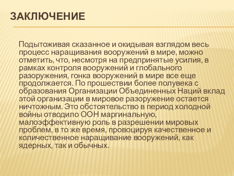 усилия, в рамках контроля вооружений и глобального разоружения, гонка вооружений в мире все еще продолжается. По прошествии более полувека с образования Организации Объединенных Наций вклад этой организации в мировое разоружение остается ничтожным. Это обстоятельство в период холодной войны отводило ООН маргинальную, малоэффективную роль в разрешении мировых проблем, в то же время, провоцируя качественное и количественное наращивание вооружений, как ядерных, так и обычных.