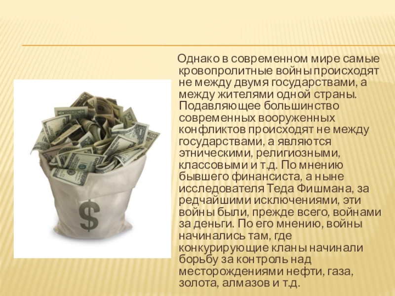Подавляющее большинство современных вооруженных конфликтов происходят не между государствами, а являются этническими, религиозными, классовыми и т.д. По мнению бывшего финансиста, а ныне исследователя Теда Фишмана, за редчайшими исключениями, эти войны были, прежде всего, войнами за деньги. По его мнению, войны начинались там, где конкурирующие кланы начинали борьбу за контроль над месторождениями нефти, газа, золота, алмазов и т.д.