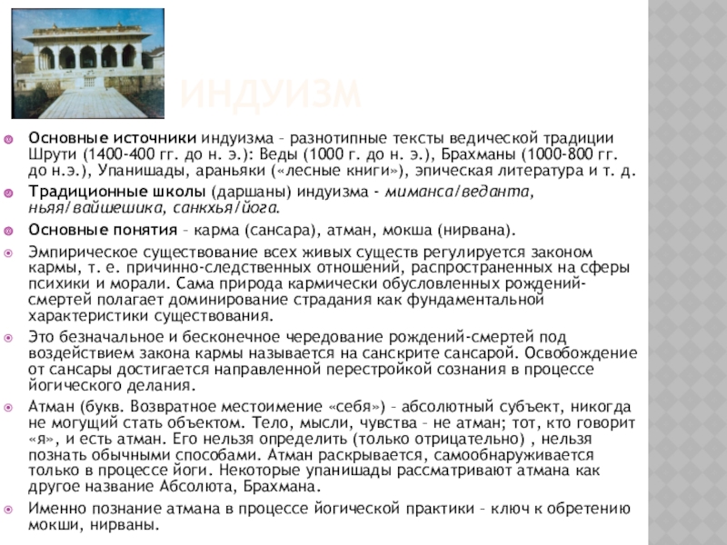 Основные понятия – карма (сансара), атман, мокша (нирвана).