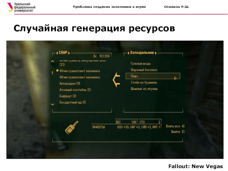 Случайная генерация ресурсовFallout: New VegasПроблемы создания экономики в играх		Османов Р.Ш.
