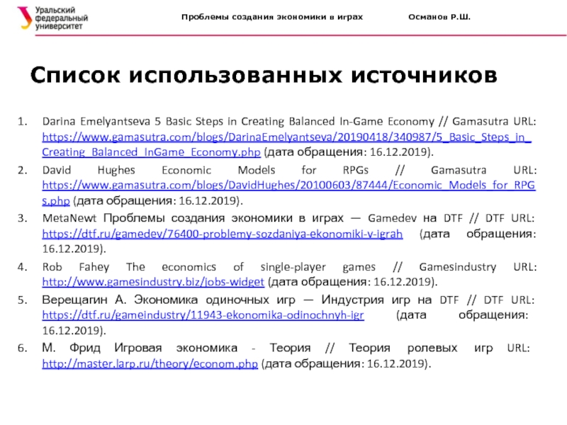 Проблемы создания экономики в играх		Османов Р.Ш.Список использованных источниковDarina Emelyantseva 5 Basic Steps in Creating Balanced In-Game Economy