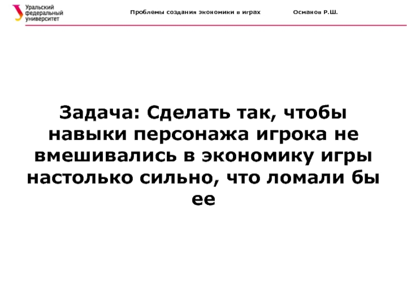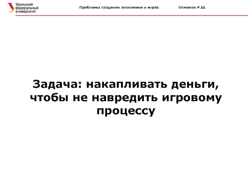 Задача: накапливать деньги, чтобы не навредить игровому процессу Проблемы создания экономики в играх		Османов Р.Ш.