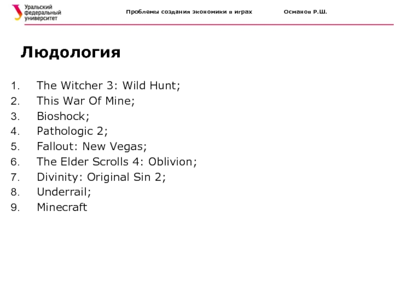 Проблемы создания экономики в играх		Османов Р.Ш.ЛюдологияThe Witcher 3: Wild Hunt;This War Of Mine;Bioshock;Pathologic 2;Fallout: New Vegas;The Elder