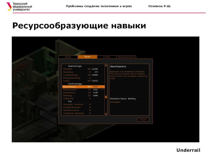 Ресурсообразующие навыкиUnderrailПроблемы создания экономики в играх		Османов Р.Ш.