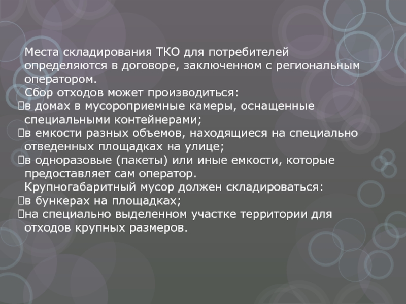 Слайд 6Места складирования ТКО для потребителей определяются в договоре, заключенном с