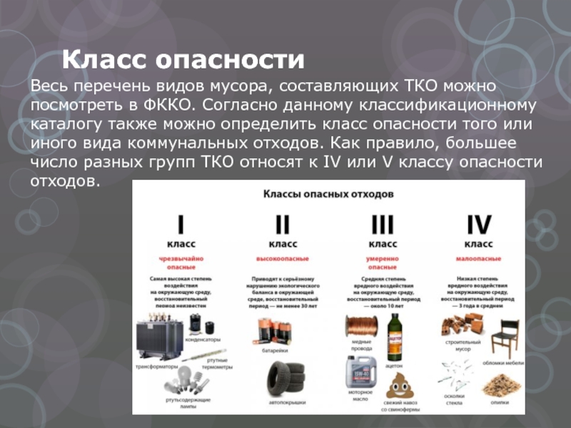 иного вида коммунальных отходов. Как правило, большее число разных групп ТКО относят к IV или V классу опасности отходов.