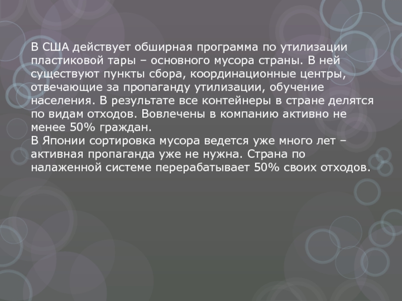 Слайд 19В США действует обширная программа по утилизации пластиковой тары –