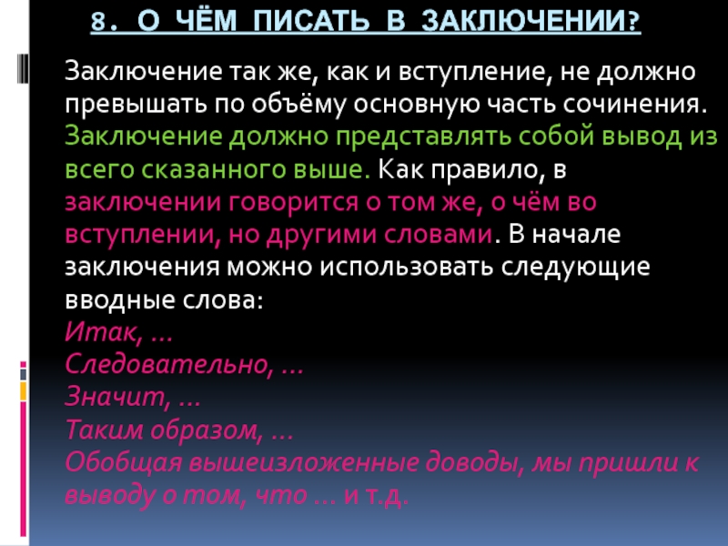 представлять собой вывод из всего сказанного выше. Как правило, в заключении говорится о том же, о чём во вступлении, но другими словами. В начале заключения можно использовать следующие вводные слова: