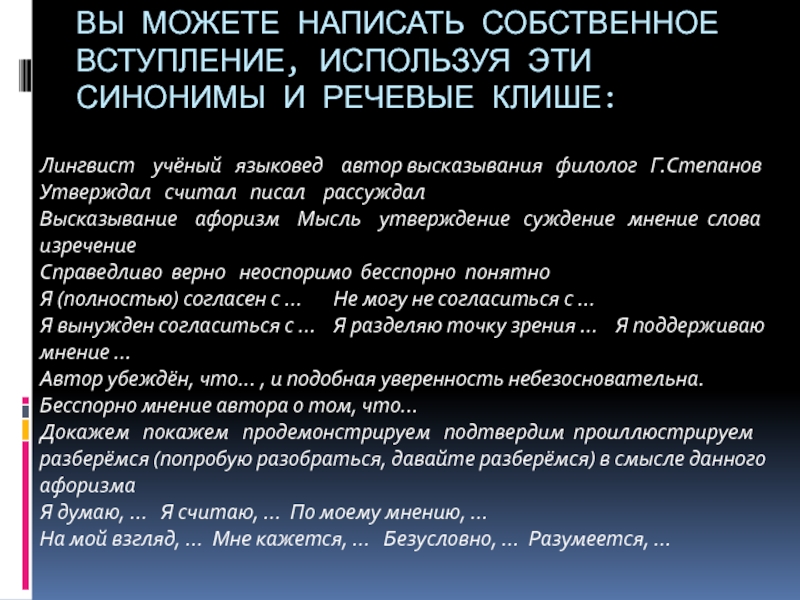 Слайд 6Вы можете написать собственное вступление, используя эти синонимы и речевые