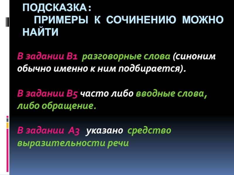 Например, используя в предложении….сюда вставить номер предложения, где есть разговорное слово – оно дано в задании В) разговорное слово «…..»сюда вставить слово из задания В1, автор эмоционально воздействует на читателя. А в предложении….. (сюда вставить номер предложения, где есть вводное слово – оно дано в задании В5) автор использует вводное слово «……»сюда вставить вводное слово – оно дано в задании В5 , чтобы выразить отношение говорящего к высказываемой мысли.