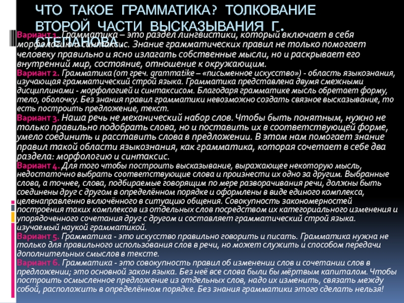 Слайд 9Что такое ГРАММАТИКА? Толкование второй части высказывания Г.Степанова.