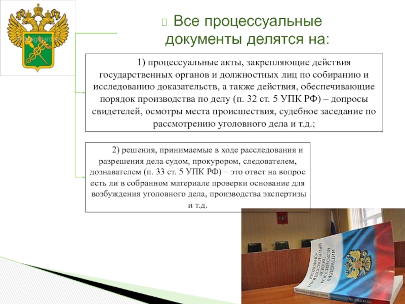 2) решения, принимаемые в ходе расследования и разрешения дела судом, прокурором, следователем, дознавателем (п. 33 ст. 5 УПК РФ) – это ответ на вопрос есть ли в собранном материале проверки основание для возбуждения уголовного дела, производства экспертизы и т.д.
