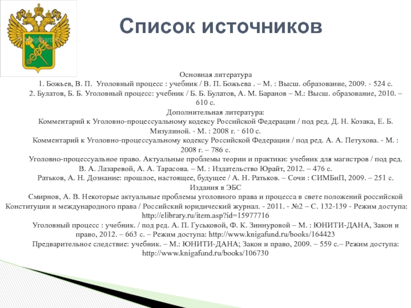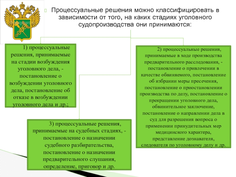 2) процессуальные решения, принимаемые в ходе производства предварительного расследования, - постановление о привлечении в качестве обвиняемого, постановление об избрании меры пресечения, постановление о приостановлении производства по делу, постановление о прекращении уголовного дела, обвинительное заключение, постановление о направлении дела в суд для разрешения вопроса о применении принудительных мер медицинского характера, представление дознавателя, следователя по уголовному делу и др.