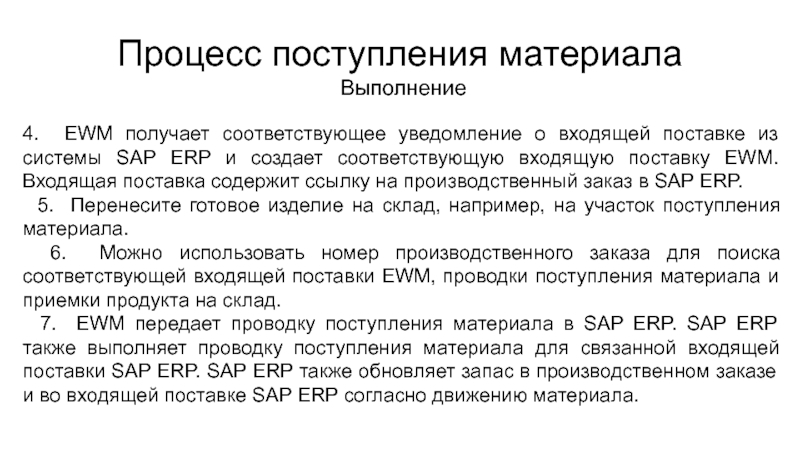 и передает ее в EWM. Предпосылкой для этого является определение соответствующих параметров настройки в пользовательской настройке для SAP ERP таким образом, чтобы в SAP ERP автоматически выполнялось подтверждение заказа для поступления материала. Это позволяет подтверждению последнего производственного этапа для продукта инициировать поступление материала в SAP ERP. После деблокирования производственного заказа можно также создать входящую поставку SAP ERP вручную. Если EWM не управляет заводом и комбинацией склада, в SAP ERP немедленно создается документ материала в проводке поступления материала. При приемке продукта на склад в SAP ERP обновляется запас.