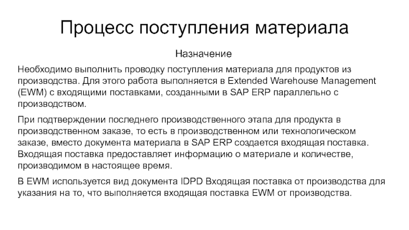 В EWM используется вид документа IDPD Входящая поставка от производства для указания на то, что выполняется входящая поставка EWM от производства.