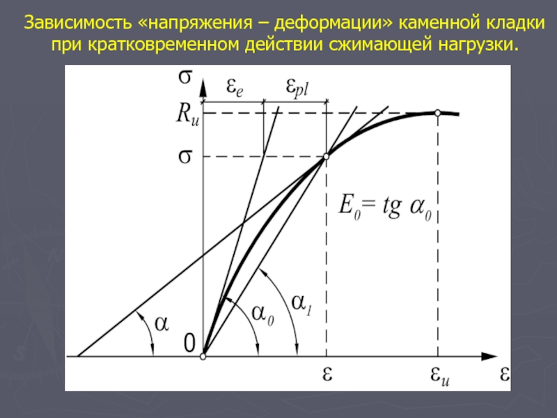 Слайд 5Зависимость «напряжения – деформации» каменной кладки при кратковременном действии сжимающей