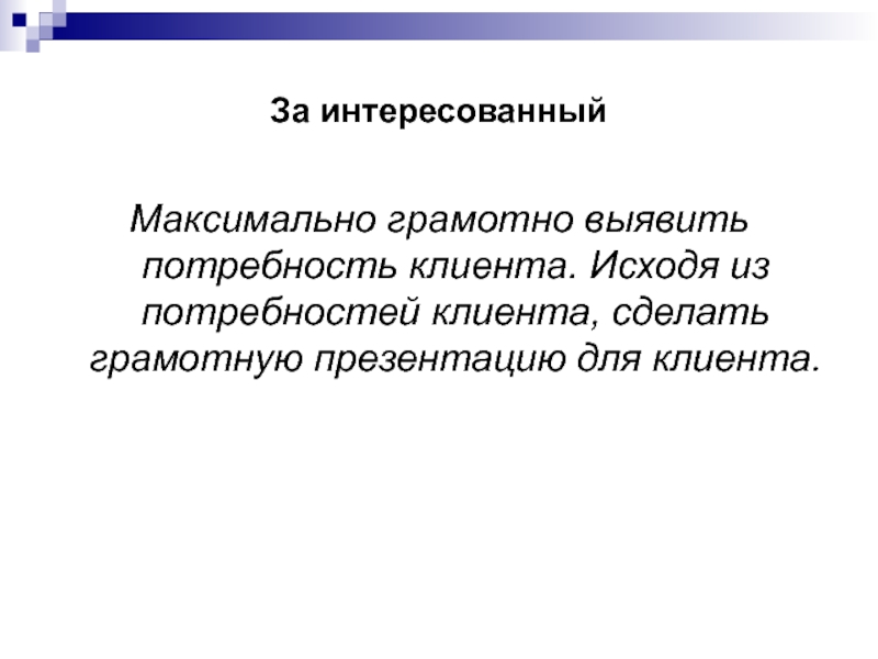 За интересованныйМаксимально грамотно выявить потребность клиента. Исходя из потребностей клиента, сделать грамотную презентацию для клиента.
