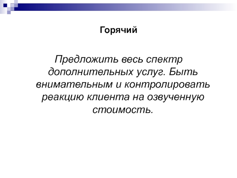 ГорячийПредложить весь спектр дополнительных услуг. Быть внимательным и контролировать реакцию клиента на озвученную стоимость.