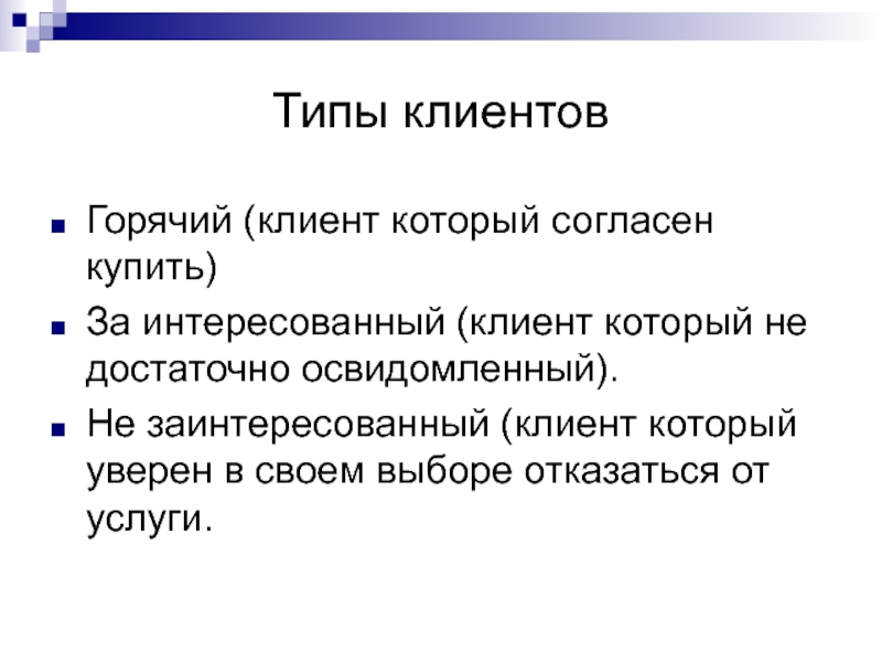 Типы клиентовГорячий (клиент который согласен купить) За интересованный (клиент который не достаточно освидомленный).Не заинтересованный (клиент который уверен