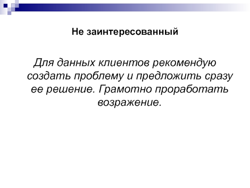 Не заинтересованныйДля данных клиентов рекомендую создать проблему и предложить сразу ее решение. Грамотно проработать возражение.
