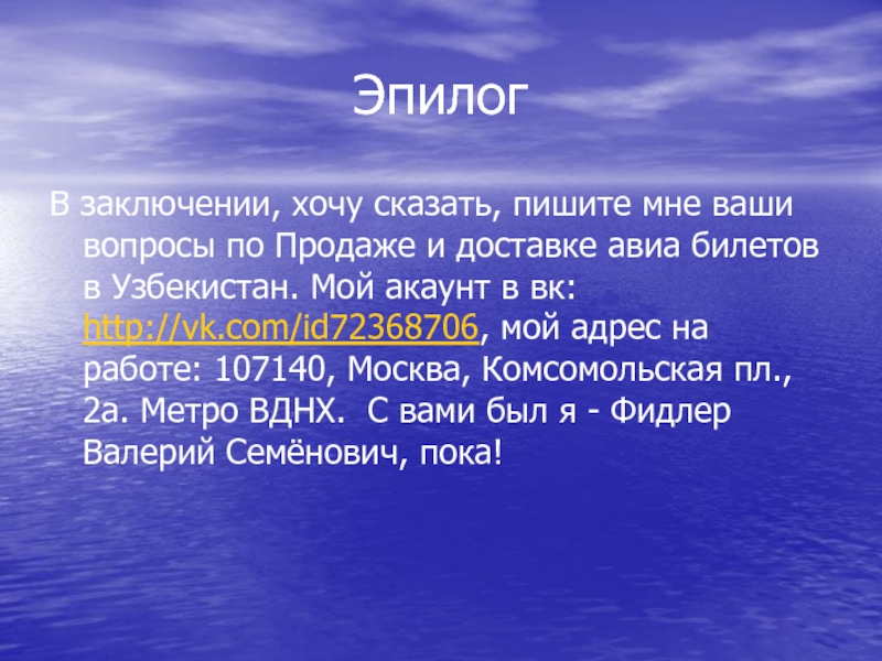 ЭпилогВ заключении, хочу сказать, пишите мне ваши вопросы по Продаже и доставке авиа билетов в Узбекистан. Мой