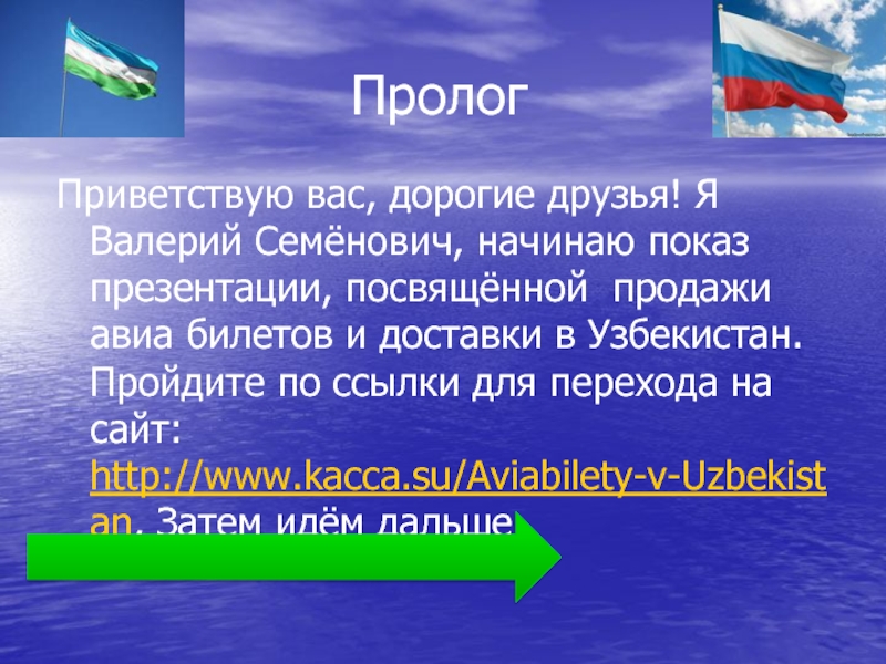 ПрологПриветствую вас, дорогие друзья! Я Валерий Семёнович, начинаю показ презентации, посвящённой продажи авиа билетов и доставки в Узбекистан. Пройдите по ссылки для перехода на сайт: http://www.kacca.su/Aviabilety-v-Uzbekistan, Затем идём дальше