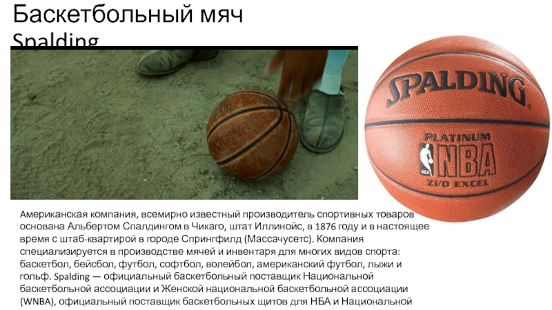 в настоящее время с штаб-квартирой в городе Спрингфилд (Массачусетс). Компания специализируется в производстве мячей и инвентаря для многих видов спорта: баскетбол, бейсбол, футбол, софтбол, волейбол, американский футбол, лыжи и гольф. Spalding — официальный баскетбольный поставщик Национальной баскетбольной ассоциации и Женской национальной баскетбольной ассоциации (WNBA), официальный поставщик баскетбольных щитов для НБА и Национальной университетской атлетической ассоциации