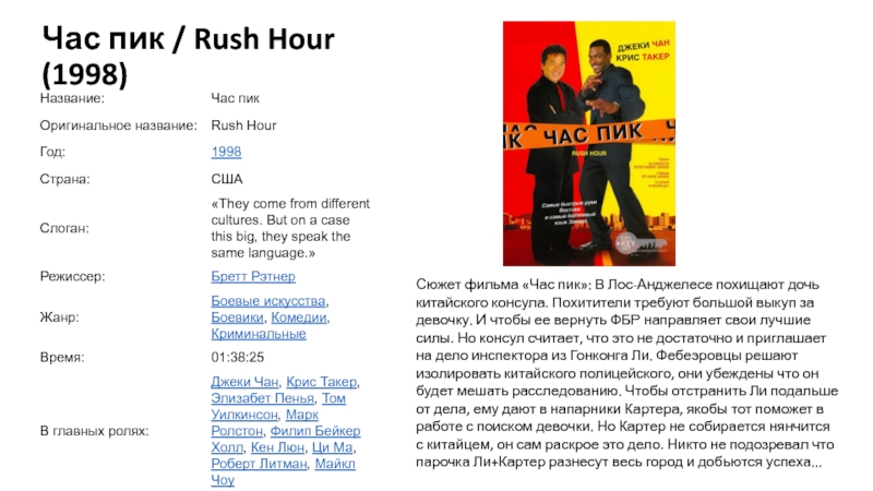 за девочку. И чтобы ее вернуть ФБР направляет свои лучшие силы. Но консул считает, что это не достаточно и приглашает на дело инспектора из Гонконга Ли. Фебеэровцы решают изолировать китайского полицейского, они убеждены что он будет мешать расследованию. Чтобы отстранить Ли подальше от дела, ему дают в напарники Картера, якобы тот поможет в работе с поиском девочки. Но Картер не собирается нянчится с китайцем, он сам раскрое это дело. Никто не подозревал что парочка Ли+Картер разнесут весь город и добьются успеха...