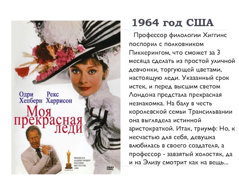1964 год США   Профессор филологии Хиггинс поспорил с полковником Пиккерингом, что сможет за 3 месяца