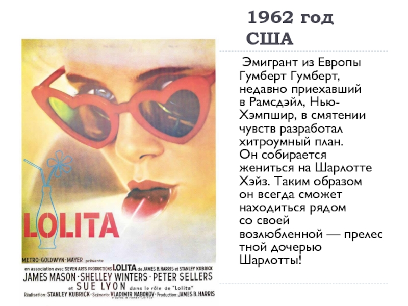 1962 год США  Эмигрант из Европы Гумберт Гумберт, недавно приехавший в Рамсдэйл, Нью-Хэмпшир, в смятении чувств разработал хитроумный план.