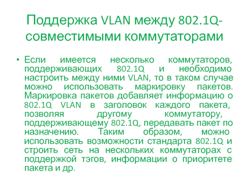 Слайд 59Поддержка VLAN между 802.1Q-совместимыми коммутаторами