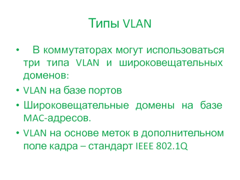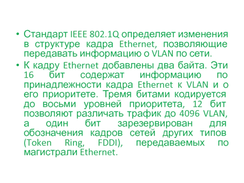 Слайд 44Стандарт IEEE 802.1Q определяет изменения в структуре кадра Ethernet, позволяющие
