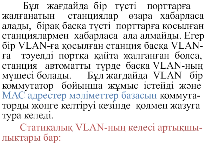 алады, бірақ басқа түсті порттарға қосылған станциялармен хабарласа ала алмайды. Егер бір VLAN-ға қосылған станция басқа VLAN-ға тәуелді портқа қайта жалғанған болса, станция автоматты түрде басқа VLAN-ның мүшесі болады. Бұл жағдайда VLAN бір коммутатор бойынша жұмыс істейді және МАС адрестер мәліметтер базасын коммута-торды жөнге келтіруі кезінде қолмен жазуға тура келеді.