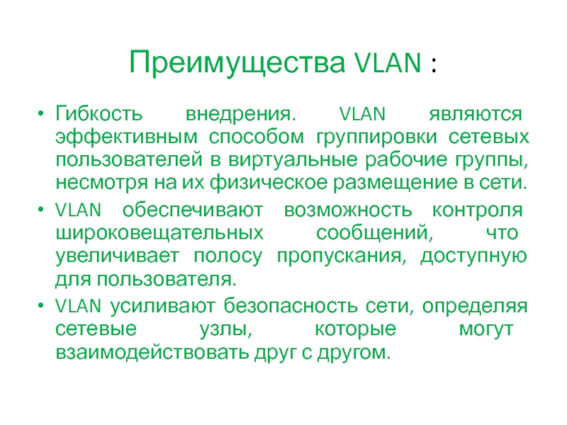VLAN обеспечивают возможность контроля широковещательных сообщений, что увеличивает полосу пропускания, доступную для пользователя.