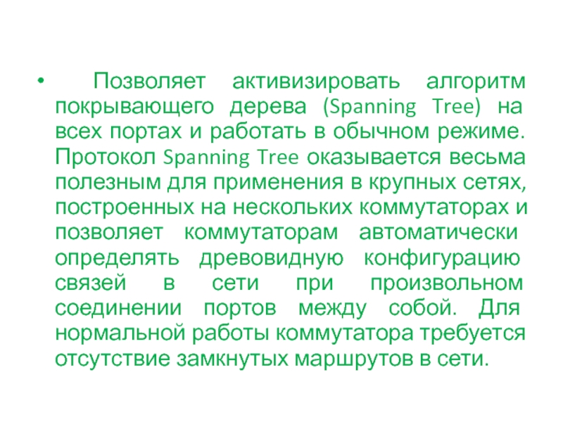 Протокол Spanning Tree оказывается весьма полезным для применения в крупных сетях, построенных на нескольких коммутаторах и позволяет коммутаторам автоматически определять древовидную конфигурацию связей в сети при произвольном соединении портов между собой. Для нормальной работы коммутатора требуется отсутствие замкнутых маршрутов в сети.