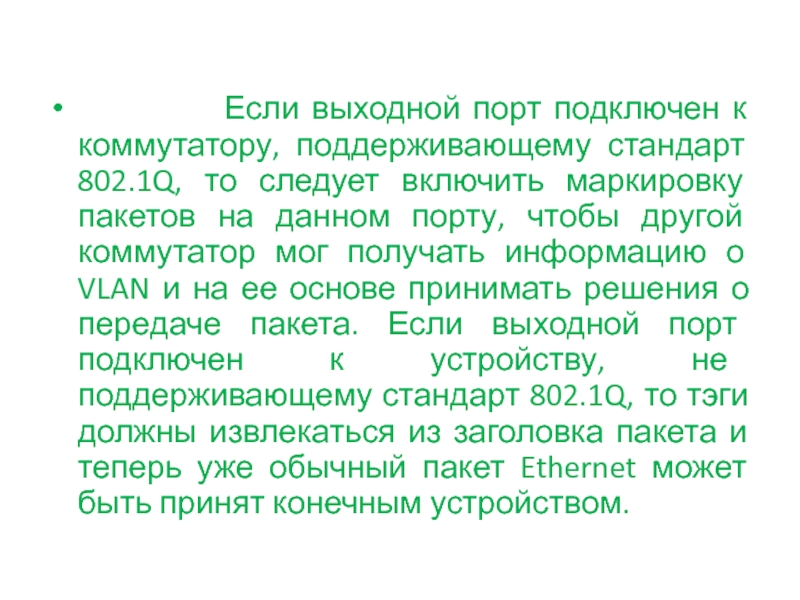 на данном порту, чтобы другой коммутатор мог получать информацию о VLAN и на ее основе принимать решения о передаче пакета. Если выходной порт подключен к устройству, не поддерживающему стандарт 802.1Q, то тэги должны извлекаться из заголовка пакета и теперь уже обычный пакет Ethernet может быть принят конечным устройством.