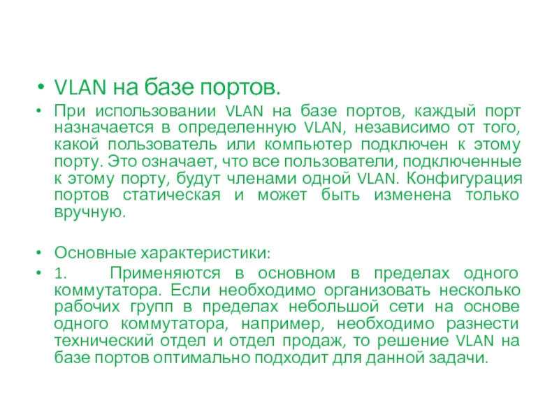 или компьютер подключен к этому порту. Это означает, что все пользователи, подключенные к этому порту, будут членами одной VLAN. Конфигурация портов статическая и может быть изменена только вручную.