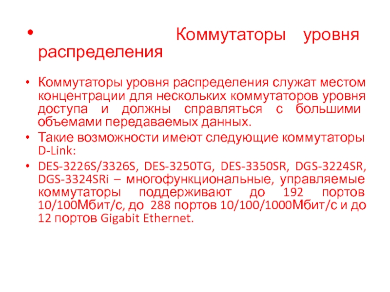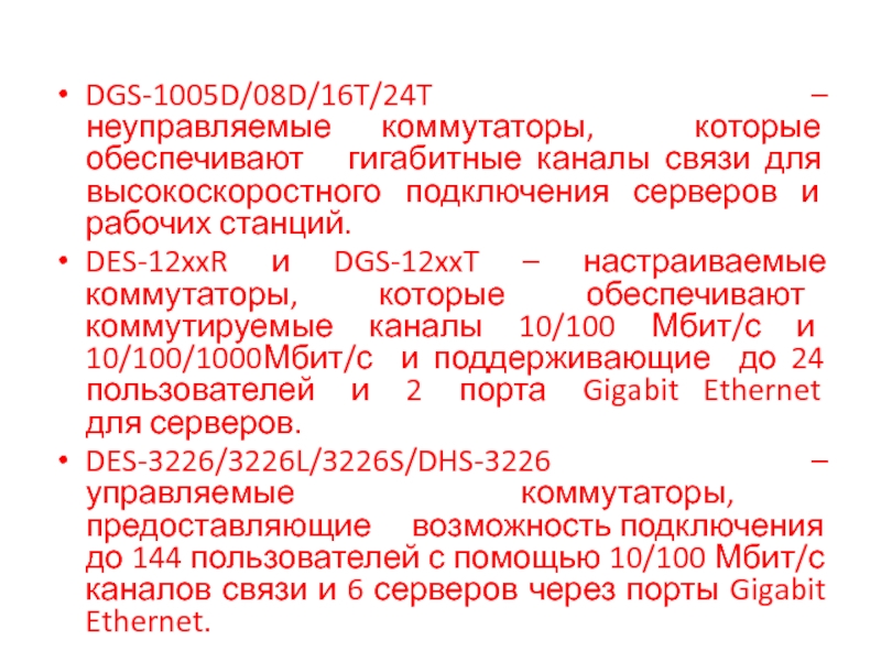 DES-3226S/3326S, DES-3250TG, DES-3350SR, DGS-3224SR, DGS-3324SRi – многофункциональные, управляемые коммутаторы поддерживают до 192 портов 10/100Мбит/с, до 288 портов 10/100/1000Мбит/с и до 12 портов Gigabit Ethernet.