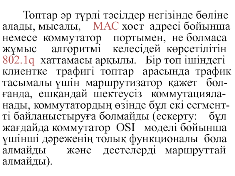 портымен, не болмаса жұмыс алгоритмі келесідей көрсетілітін 802.1q хаттамасы арқылы. Бір топ ішіндегі клиентке трафигі топтар арасында трафик тасымалы үшін маршрутизатор қажет бол-ғанда, ешқандай шектеусіз коммутацияла-нады, коммутатордың өзінде бұл екі сегмент-ті байланыстыруға болмайды (ескерту: бұл жағдайда коммутатор OSI моделі бойынша үшінші дәреженің толық функционалы бола алмайды және дестелерді маршруттай алмайды).