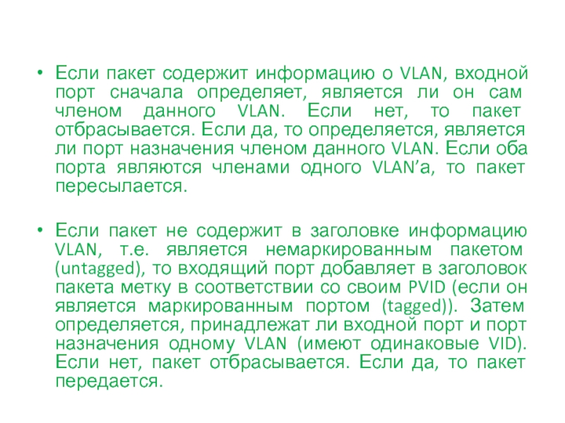 пакет отбрасывается. Если да, то определяется, является ли порт назначения членом данного VLAN. Если оба порта являются членами одного VLAN’а, то пакет пересылается.