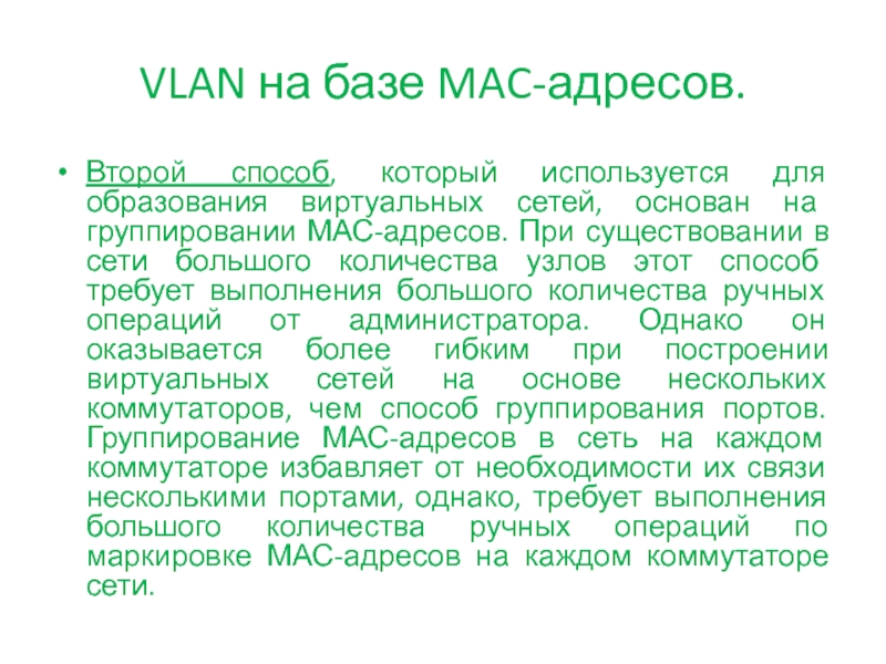 количества узлов этот способ требует выполнения большого количества ручных операций от администратора. Однако он оказывается более гибким при построении виртуальных сетей на основе нескольких коммутаторов, чем способ группирования портов. Группирование МАС-адресов в сеть на каждом коммутаторе избавляет от необходимости их связи несколькими портами, однако, требует выполнения большого количества ручных операций по маркировке МАС-адресов на каждом коммутаторе сети.