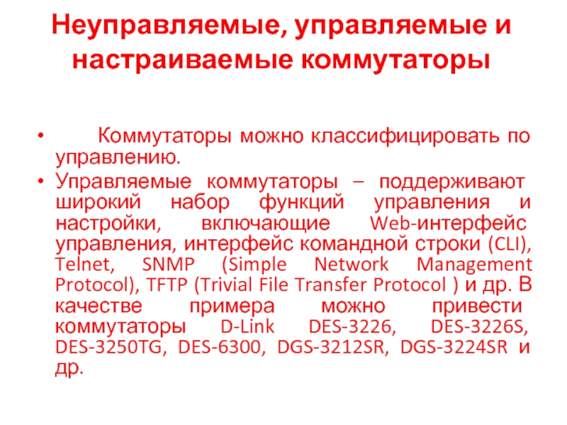 и настройки, включающие Web-интерфейс управления, интерфейс командной строки (CLI), Telnet, SNMP (Simple Network Management Protocol), TFTP (Trivial File Transfer Protocol ) и др. В качестве примера можно привести коммутаторы D-Link DES-3226, DES-3226S, DES-3250TG, DES-6300, DGS-3212SR, DGS-3224SR и др.