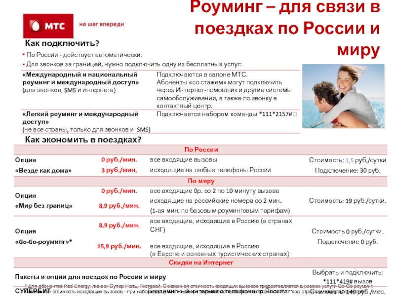 * Для абонентов Red Energy, линеек Супер Ноль, Гостевой. Сниженная стоимость входящих вызовов предоставляется в рамках услуги Go-Go роуминг. Сниженная стоимость исходящих вызовов - при наборе в роуминге номера вызываемого абонента в формате *137*код страны и номер абонента#.