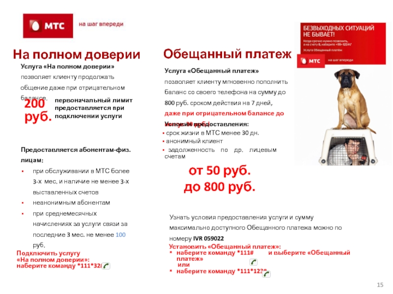 Услуга «Обещанный платеж» позволяет клиенту мгновенно пополнить баланс со своего телефона на сумму до 800 руб. сроком действия на 7 дней, даже при отрицательном балансе до минус 30 руб.!