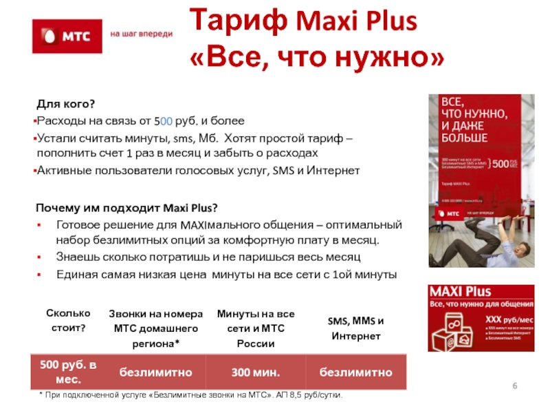 * При подключенной услуге «Безлимитные звонки на МТС». АП 8,5 руб/сутки.