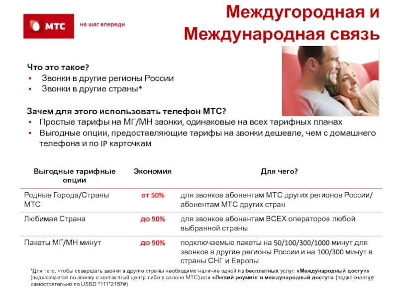 *Для того, чтобы совершать звонки в другие страны необходимо наличие одной из бесплатных услуг: «Международный доступ» (подключается по звонку в контактный центр либо в салоне МТС) или «Легкий роуминг и международный доступ» (подключается самостоятельно по USSD *111*2157#)