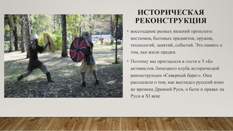 Историческая реконструкция воссоздание разных явлений прошлого: костюмов, бытовых предметов, оружия, технологий, занятий, событий. Это память о том,