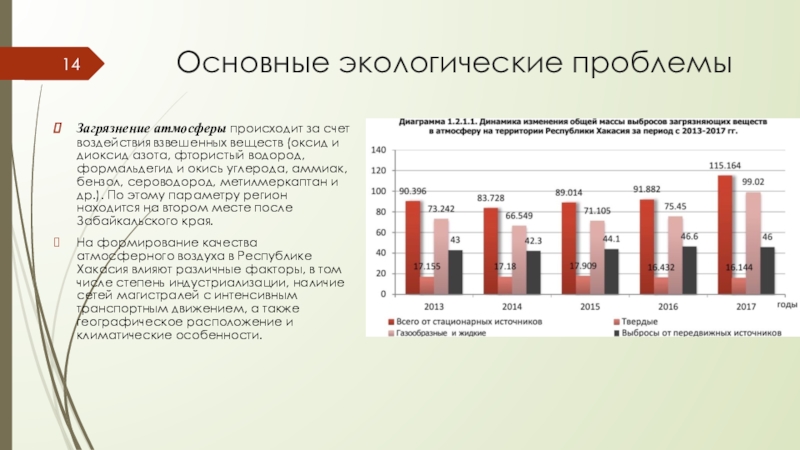 На формирование качества атмосферного воздуха в Республике Хакасия влияют различные факторы, в том числе степень индустриализации, наличие сетей магистралей с интенсивным транспортным движением, а также географическое расположение и климатические особенности.