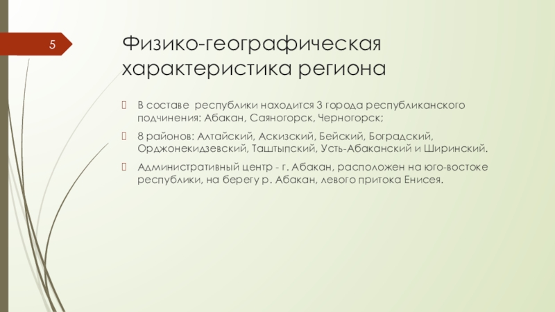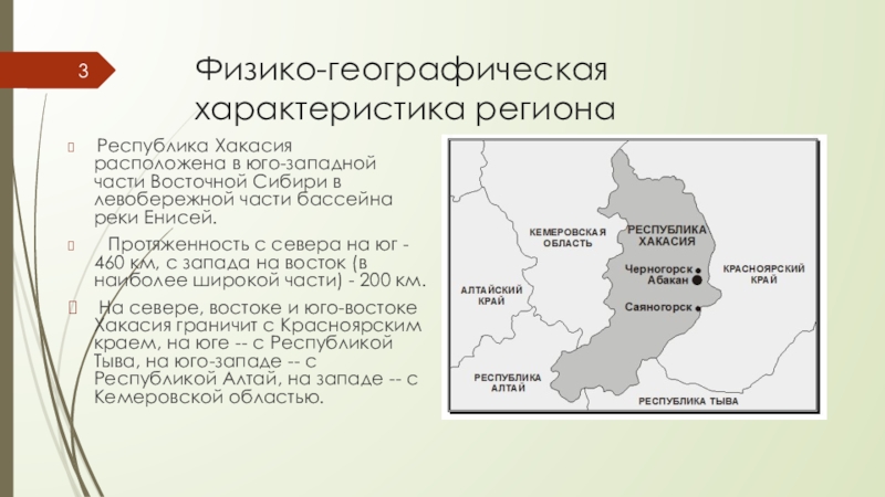 Административный центр - г. Абакан, расположен на юго-востоке республики, на берегу р. Абакан, левого притока Енисея.