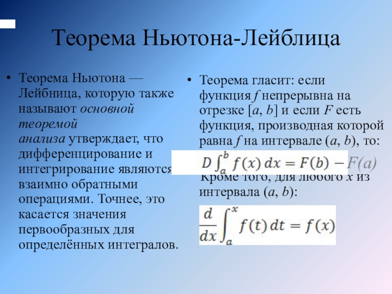 Теорема гласит: если функция f непрерывна на отрезке [a, b] и если F есть функция, производная которой равна f на интервале (a, b), то: